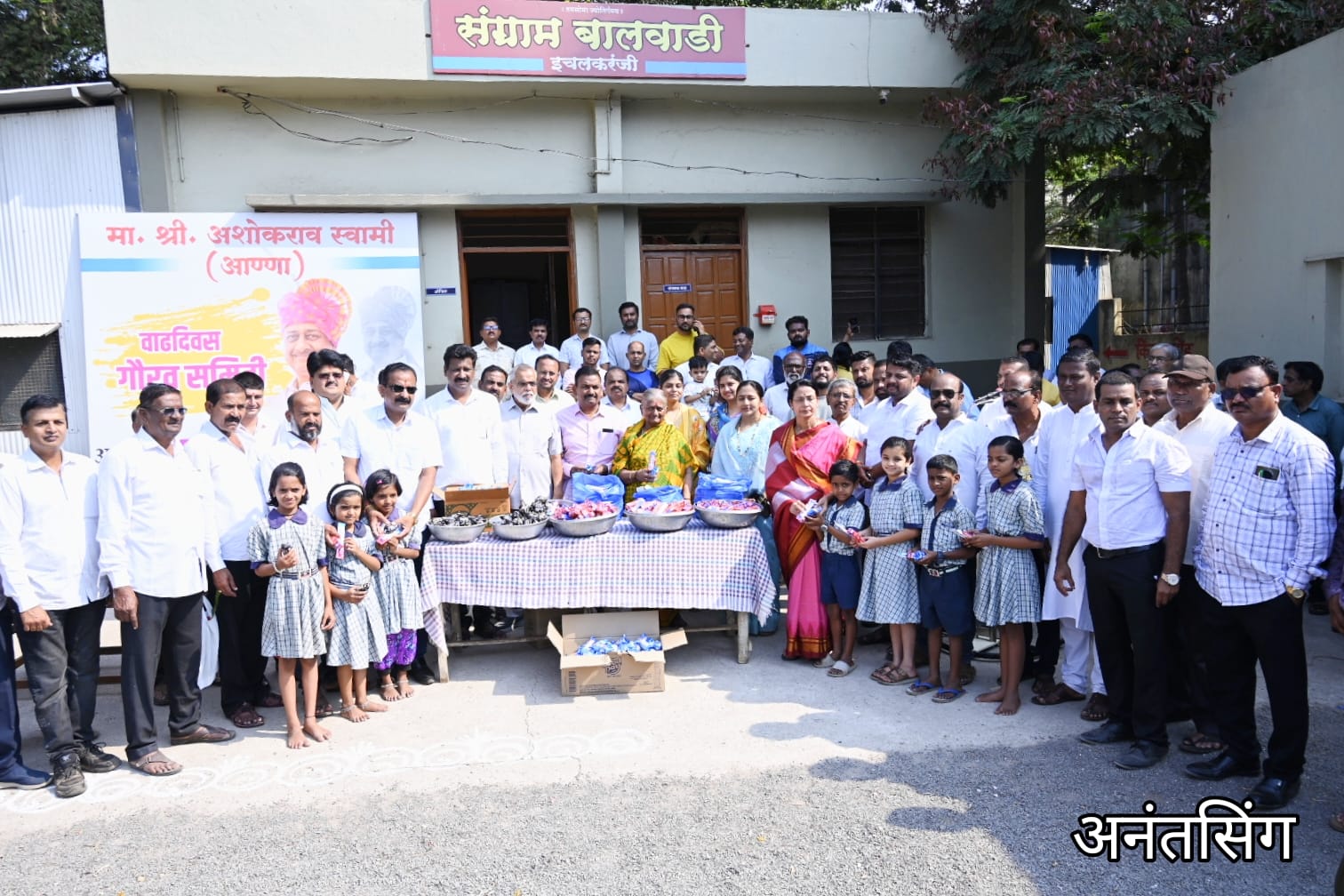 कार्यक्रमाची सुरुवात अरुण विद्यामंदिर संग्राम बालवाडी येथे विद्यार्थ्यांच्या हस्ते केक कापून करण्यात आली. यावेळी माजी नगराध्यक्ष तथा विद्यमान नगरसेविका अॅड. सौ. अलका स्वामी, शकुंतला स्वामी (आऊ), माजी नगरसेवक दिलीप मुथा यांच्या हस्ते विद्यार्थ्यांना खाऊ व भोजन वाटप करण्यात आले. तसेच सौ. अमृता स्वामी व सौ. मानसा स्वामी यांच्या हस्ते विद्यार्थ्यांना टूथपेस्ट व टूथब्रशचे वितरण करण्यात आले.
